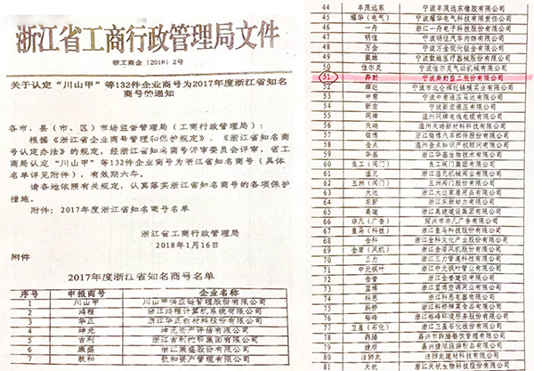 2018年1月16日,經(jīng)浙江省知名商號評審委員會評審,浙江省工商局認(rèn)定的“浙江省知名商號”名單公布:寧波奔野重工股份有限公司的商號“奔野..