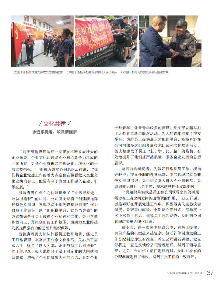 中共浙拖奔野黨組織在步入新時(shí)代、走向新起點(diǎn)、踏上新征程的道路上,充分發(fā)揮一名黨員一面旗幟的作用,為企業(yè)的發(fā)展和騰飛作出奉獻(xiàn)。