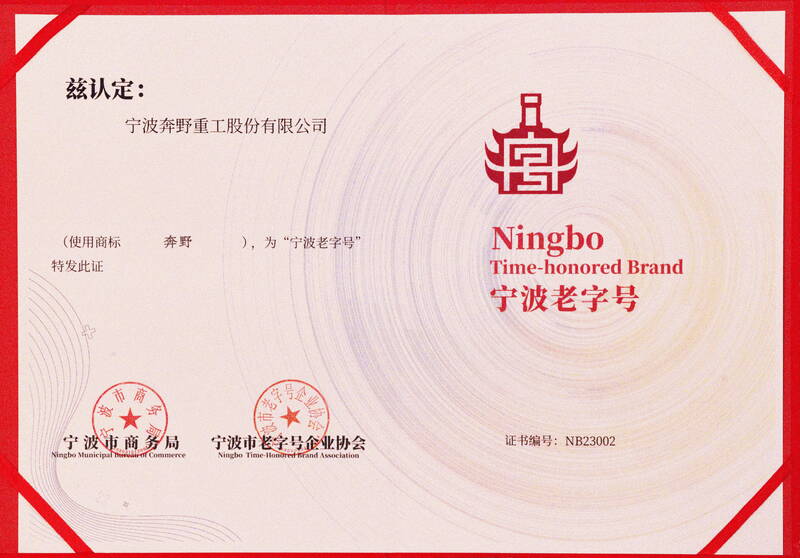 2023年11月12日,第三批“寧波老字號”授牌儀式在寧波國際會展中心2023中國(寧波)食品博覽會現(xiàn)場隆重舉行。本次活動由寧波市老字號企業(yè)協(xié)會會長張空主持,寧波市商務(wù)局副局長葉文濤等領(lǐng)導(dǎo)出席并講話。寧波市商務(wù)局消費促進(jìn)處處長尹秋平為寧波奔野重工股份有限公司授牌,“奔野”品牌榮獲寧波老字號稱號。